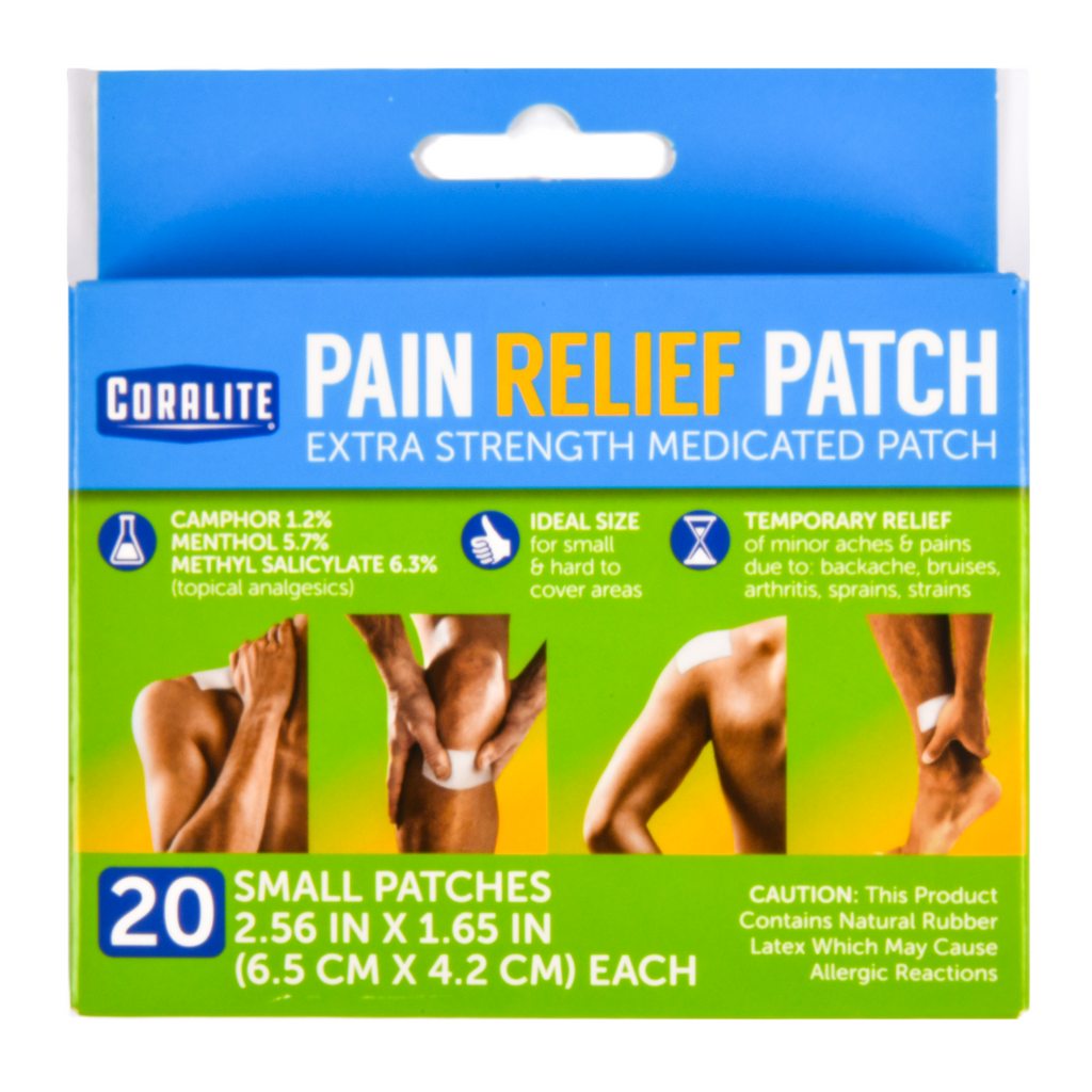 Coralite Extra Strength Pain Relief Patches provide targeted, temporary relief from muscle aches, joint pain, back pain, sprains, and strains using a powerful topical analgesic formula with camphor, menthol, and methyl salicylate.